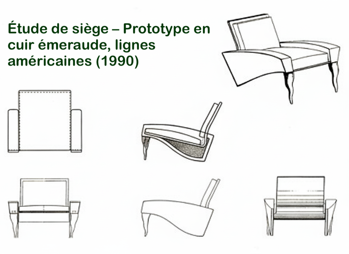 Étude complète d’un fauteuil conçu en 1990 : croquis techniques, vues structurelles et exploration des volumes d’un prototype en cuir émeraude inspiré du style américain. Pièce unique issue des archives personnelles de François W. Beydoun, illustrant son travail de recherche formelle et son sens des proportions.